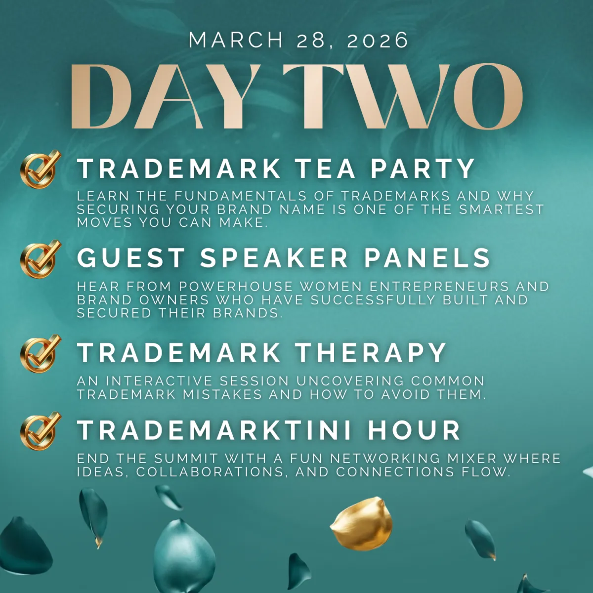 Join us for two days as we’re bringing the energy, the strategy, and the sisterhood straight to your screen. Think Trademark Tea where we spill what no one told you about securing your brand, real-talk Trademark Therapy sessions that lovingly call out your blind spots, and powerful conversations with women who are actually building and scaling.